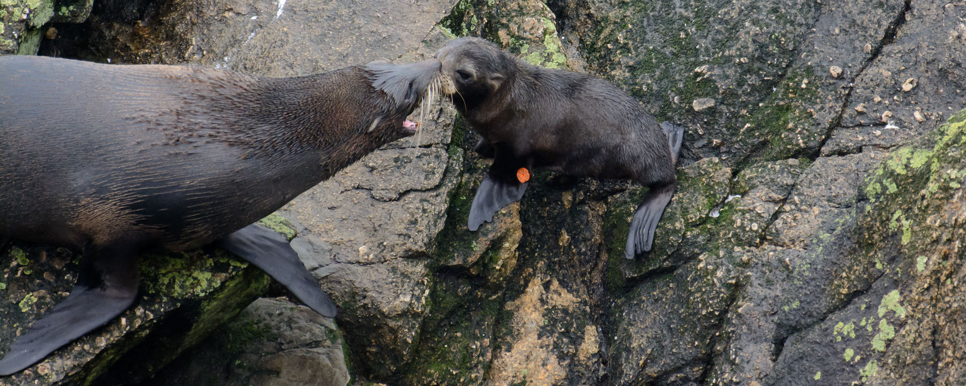 We drove down a long and straight road through sheep/goat stations, and we see in the distance nothing but haze. We follow the signs to find our parking area and pull in. There is a huge beach and we see some people walking out in the rain, enjoying the weather. We follow the signs up onto a cliff where promises of seals await.